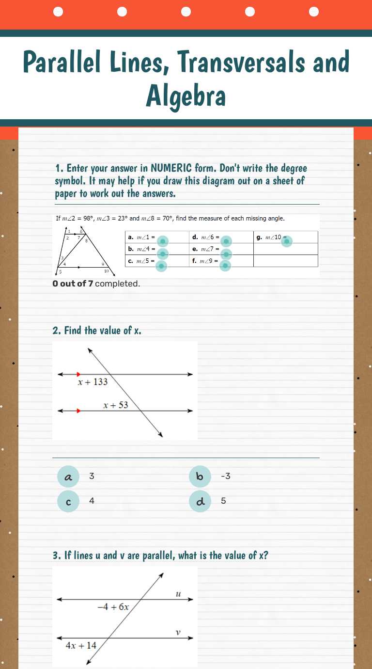 If m 2 = 58° and mz13 = 111°, then find the missing angle measures. Determine the measure of the missing angle in each diagram. What facts about angles did you use? Measure each angle and record its degree measurement in the table. Label all 8 angles starting with 1, 2, 3 and so on. Answers may include the following: Worksheet by kuta software llc. Equipped with free worksheets on identifying the angle relationships, finding the measures of interior and exterior angles, determining whether the given pairs . If m 2 = 58° and mz13 = 111°, then find the missing angle measures. Algebra and angle measures algebra can be used to find unknown values in angles formed by a transversal and parallel lines. Label all 8 angles starting with 1, 2, 3 and so on. Find the measure of the angle indicated in bold. Measure each angle and record its degree measurement in the table. Parallel lines & transversals worksheet caleb thompson name: • find angle measures using the theorem. What facts about angles did you use? Given m_1 = 65°, find the measure of each missing angle. For each set of angles name the angle pair and find the missing measurement. Find the measure of the angle indicated in bold. If m 2 = 58° and mz13 = 111°, then find the missing angle measures. Parallel lines & transversals worksheet caleb thompson name: ○ find the measures of angles. ○ identify the angles formed when parallel lines are cut by a transversal. Given m_1 = 65°, find the measure of each missing angle. Answers may include the following: 3) name two transversals for parallel lines no and pq. ○ find the measures of angles. For each set of angles name the angle pair and find the missing measurement. • understand the parallel lines cut by a transversal theorem and it's converse. Algebra and angle measures algebra can be used to find unknown values in angles formed by a transversal and parallel lines. Find the measure of the missing angles. In this lesson, you will. Equipped with free worksheets on identifying the angle relationships, finding the measures of interior and exterior angles, determining whether the given pairs . Worksheet by kuta software llc. What facts about angles did you use? If m 2 = 58° and mz13 = 111°, then find the missing angle measures. Determine the measure of the missing angle in each diagram. ○ find the measures of angles. Find the measure of the missing angles. Find the measure of the angle indicated in bold. Label all 8 angles starting with 1, 2, 3 and so on. Answers may include the following: • find angle measures using the theorem. If two parallel ines are cut by a transversal, then. Parallel lines & transversals worksheet caleb thompson name: • use algebra to find . Find the measure of the angle indicated in bold. Worksheet by kuta software llc. In this lesson, you will. ○ find the measures of angles. Measure each angle and record its degree measurement in the table. Algebra and angle measures algebra can be used to find unknown values in angles formed by a transversal and parallel lines. What facts about angles did you use? Label all 8 angles starting with 1, 2, 3 and so on. Parallel Lines And Transversals Worksheet Find The Measure Of The Missing Angles / Ncps K12 Org /. In this lesson, you will. Find the measure of the missing angles. • understand the parallel lines cut by a transversal theorem and it's converse. Given m_1 = 65°, find the measure of each missing angle. For each set of angles name the angle pair and find the missing measurement.